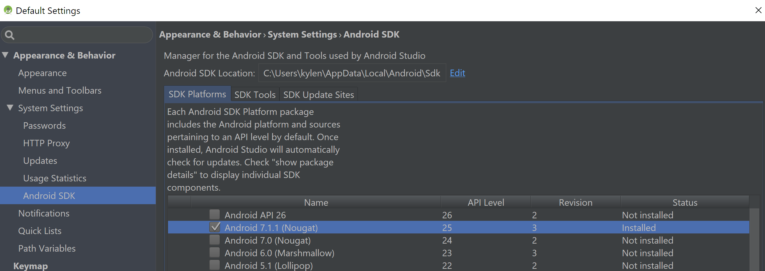 I check Android SDK manager and it says I have Android SDK Platform 25 installed.