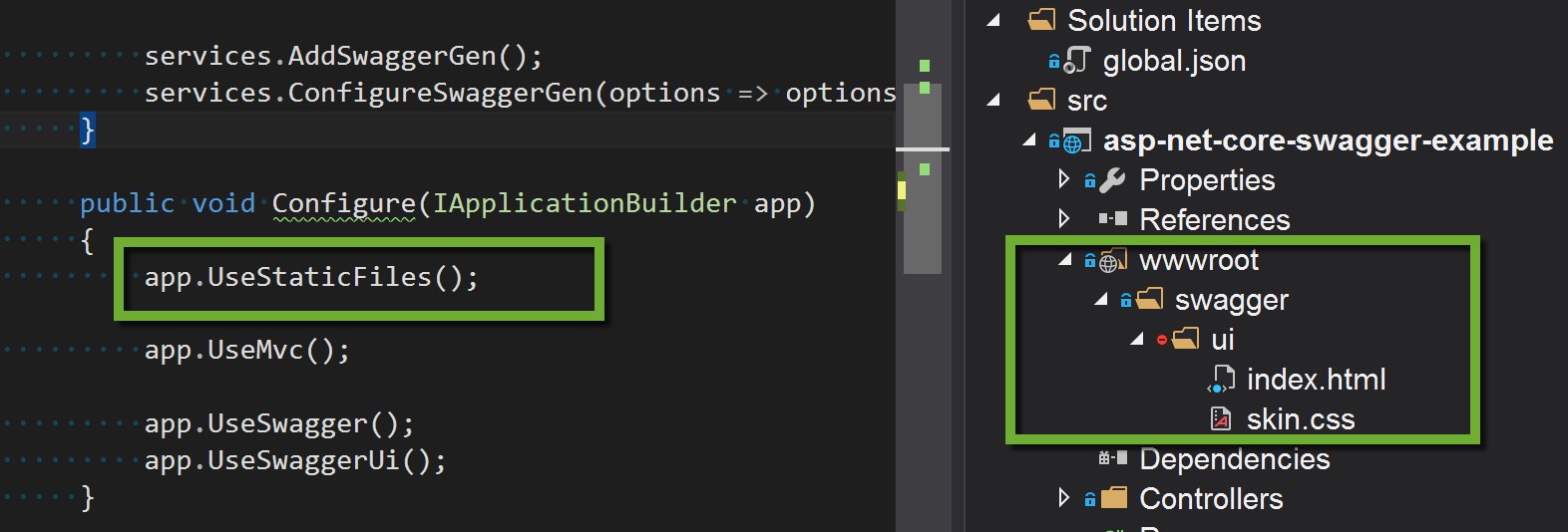 wwwroot/swagger/uifolder in your project - Copy the index.html and skin.css to the
